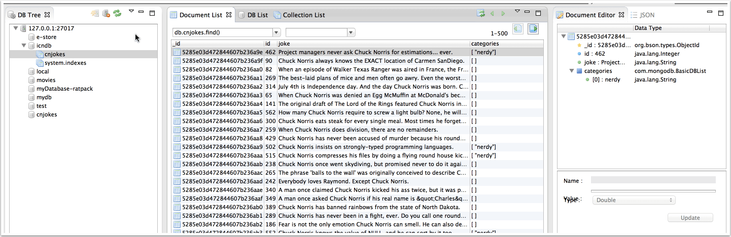 Since the format of the jokes is JSON, I decided to use a MongoDB database to store them. The native format for MongoDB is BSON, or binary JSON, so all I have to do is grab the jokes and I can just append them to a local database. To make the code easier, I use the GMongo project, which is just a Groovy wrapper around Mongo’s Java client library.